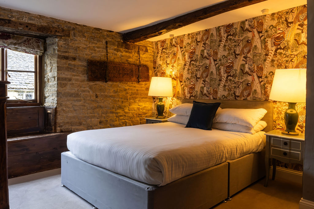 Now renamed Grouse, this newly refurbished space is full of character and calm. Its standout feature is the striking wallpaper, bringing a gentle countryside motif into the room while keeping the overall feel light and restful. With a king size bed, a bright bathroom and views over the garden and courtyard, it is a peaceful and cosy choice for a cosy stay.